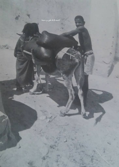 الصورة في ثلاثينيات القرن الماضي صغيرتين و شاب صغير ينقلون الماء الى اهلهم او يساعدون اهلهم بنقله .. وكماانشغل اهالي شبام في تلك الفترة بنقل الماء فان كثير من الرجال والنساء امتهنوا نقل المياة كسقائين سواء من البطحاء او من بئرين جوفية بجروب شبام اشتهرت بحلاوة مياهها وهي ( جبره) و( دومانه) وآبار اخرى تتفاوت حلاوتها او ملوحتها ايضا في جروب المدينة .. ظل الوضع هكذا حتى بداية الستينيات عندما اوصلت شركه مياه شباميه مساهمة الماء العذب عبر الانابيب الى شبام ونواحيها ومصدر تلك المياة آبار جوجة الواقعة غرب شبام.